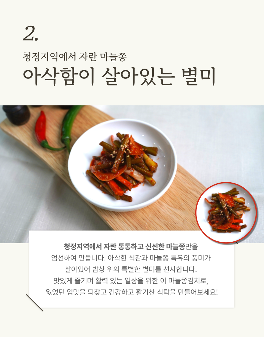 청정지역에서 자란 통통하고 신선한 마늘쫑만을 엄선하여 아삭한 식감과 마늘쫑 특유의 풍미가 살아있어 밥상 위의 특별한 별미를 선사하는 마늘쫑 장아찌입니다 (0)
