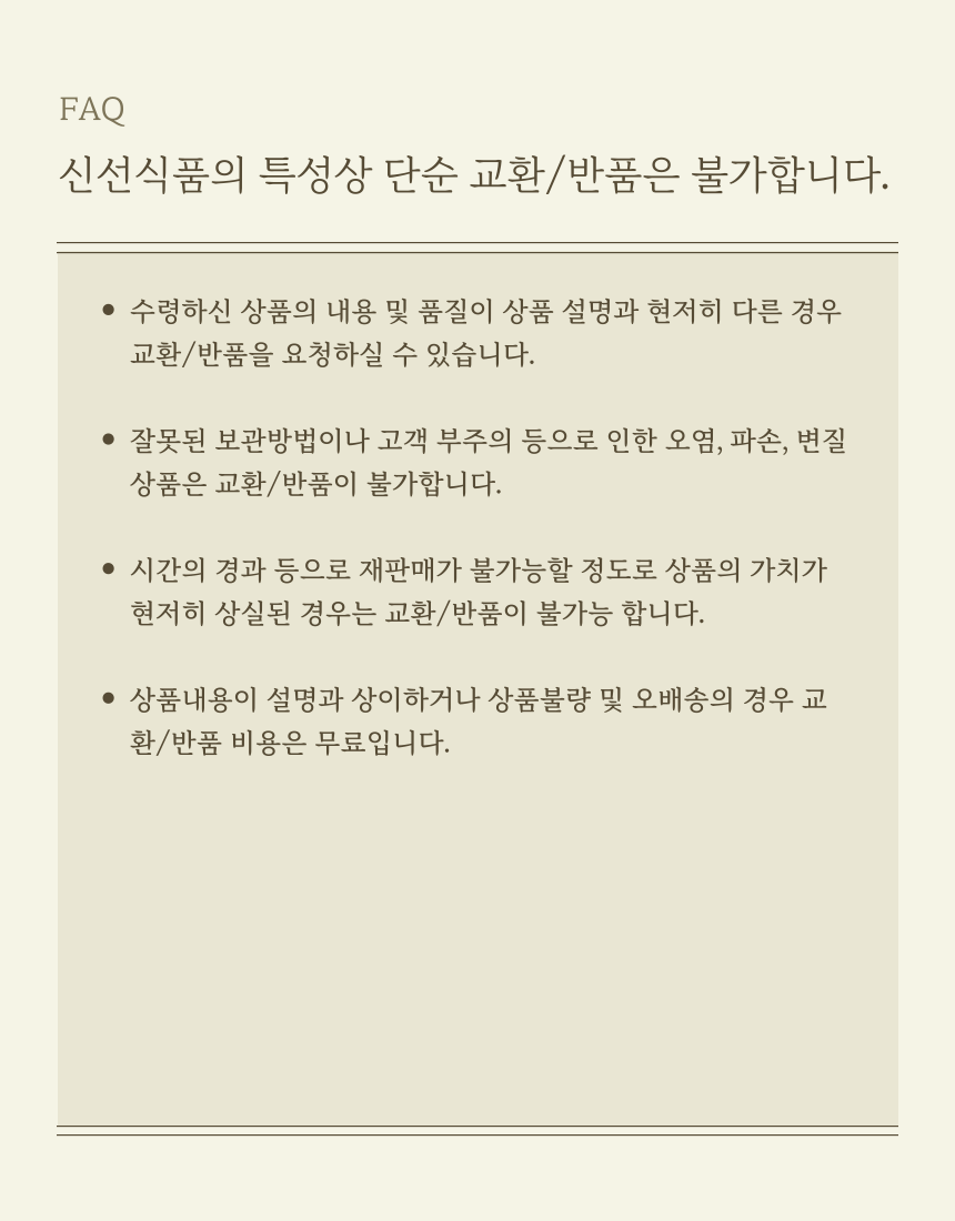 품질보증 기준에 관하여, 전자상거래 법 등에서의 소비자 보호에 관한 법률로 규정되어 있는 소비자 청약 처리 가능 범위에 해당하는 경우에 한하여 반품/ 교환 신청을 처리해 드리고 있습니다. 상품 하자 시 판매자와 필히 연락하셔야 하며 임의로 반품할 시엔 왕복 택배비가 고객님께 부과됨을 알려드립니다. 교환 및 반품은 판매자와 통화 후 수령일로부터 7일 이내에 발송해 주셔야 합니다.