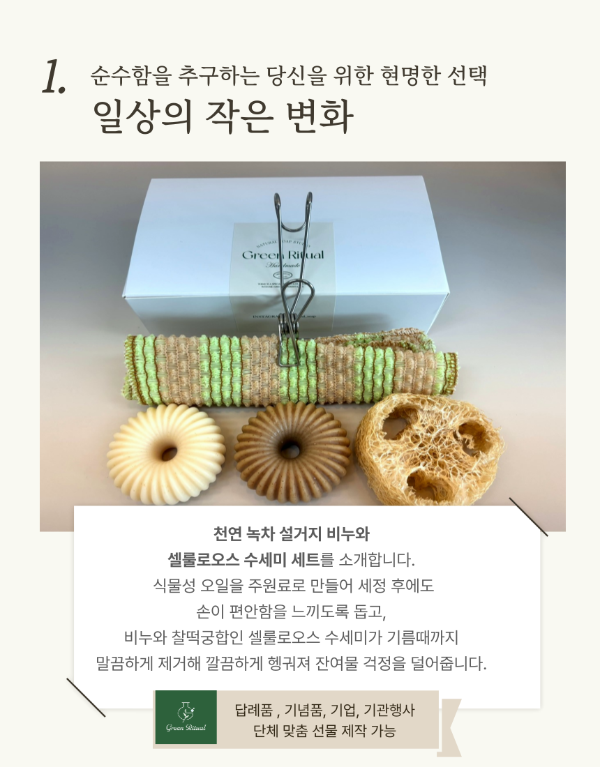 그린리추얼 비건 설거지 녹차비누 2구 천연수세미 세트 (비누2구+집게+수세미받침대+친환경옥수수망사수세