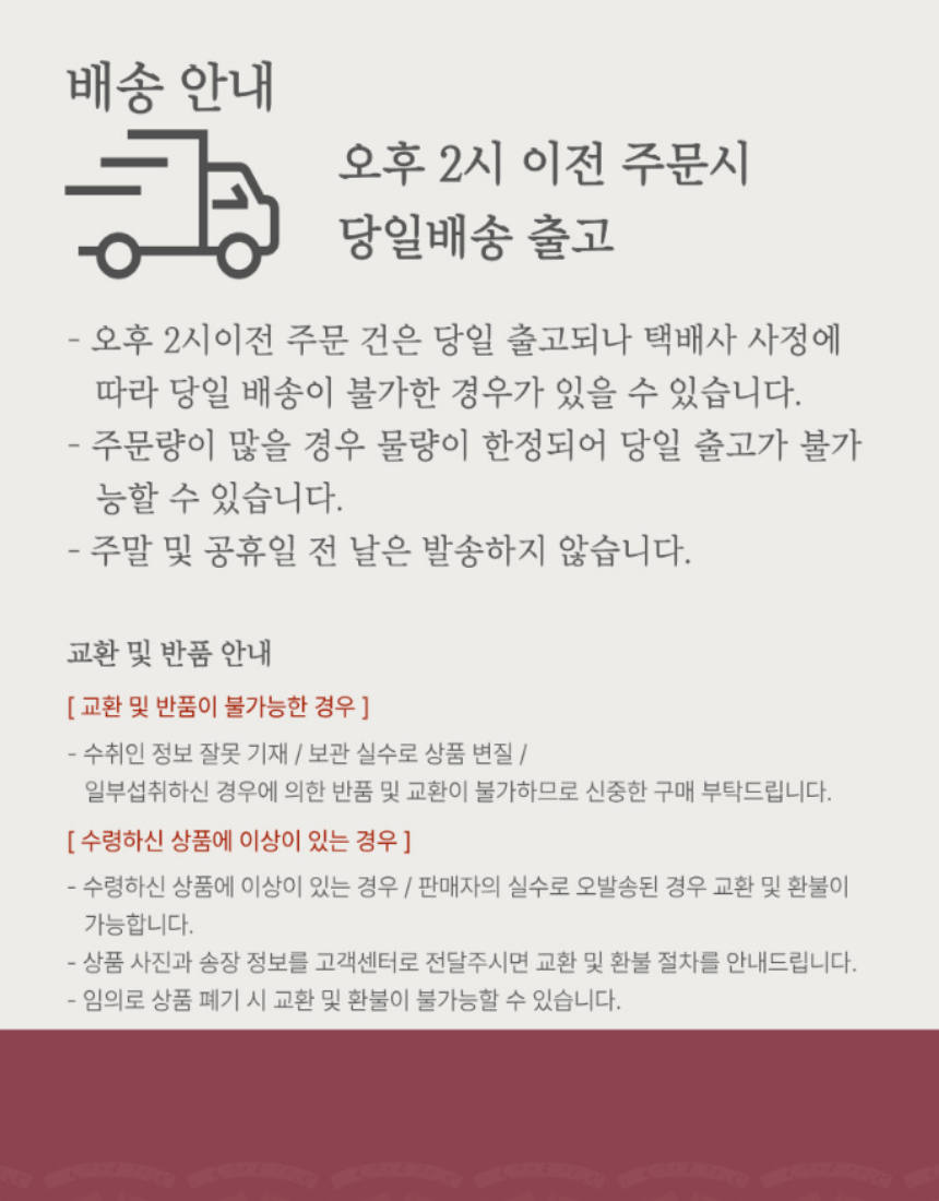당일 오전 10시까지 입금 확인된 제품은 당일 배송됩니다. 토요일, 일요일 및 공휴일은 휴무입니다. 파손된 제품은 무료 교환/반품 가능합니다.