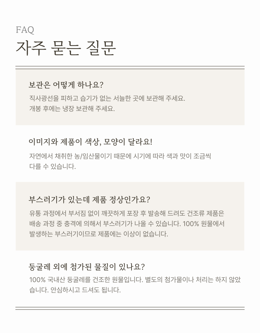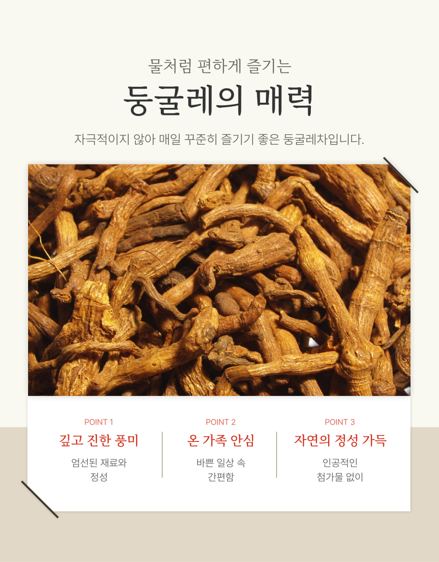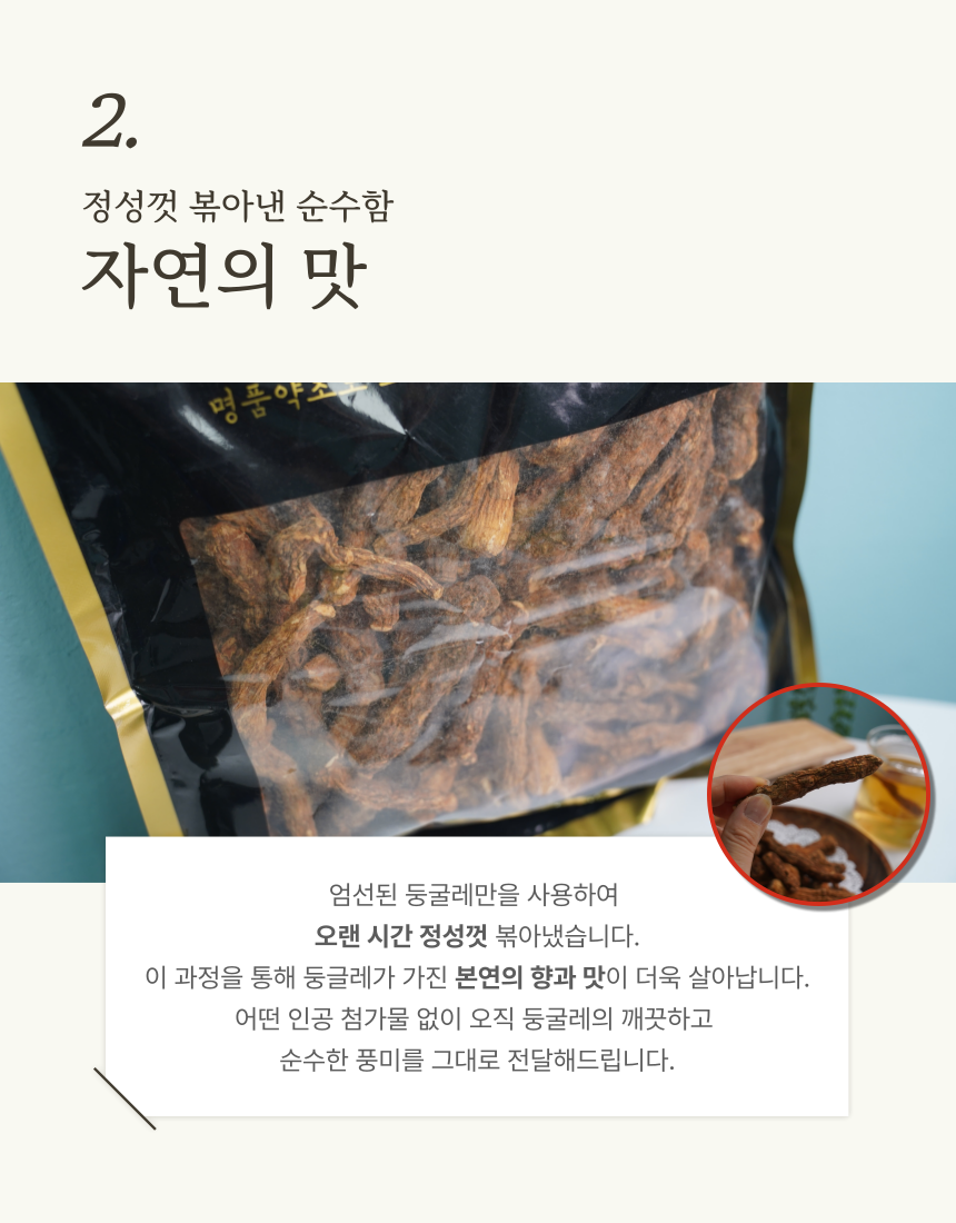 엄선된 국산 둥굴레만을 사용하여  오랜 시간 정성껏 볶아냈습니다. (0)