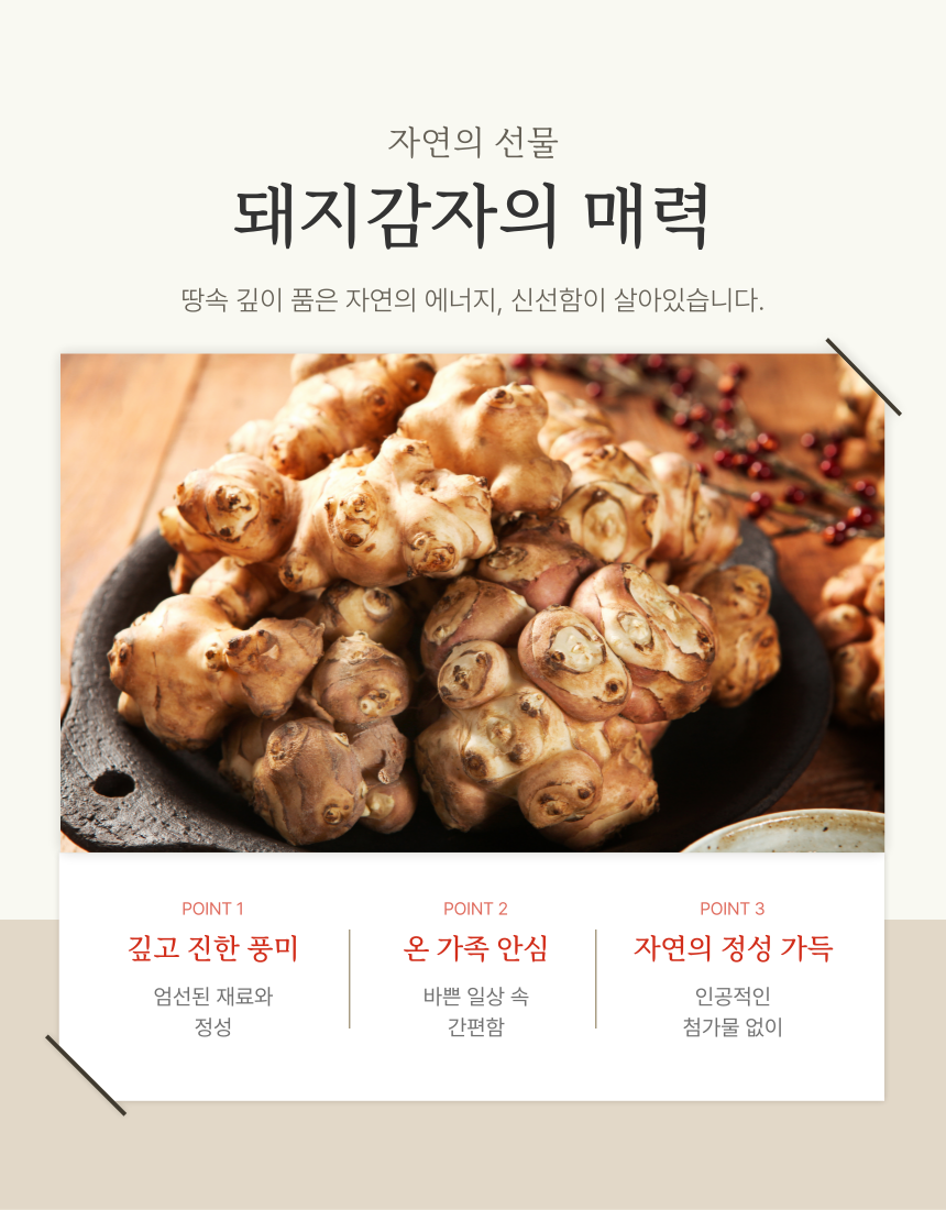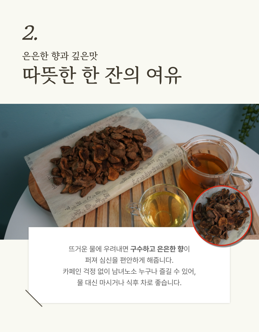 땅속 깊이 품은 자연의 에너지. 특유의 구수하고 순한 맛으로 물 대신 마시기에 부담이 없으며, 카페인이 없어 저녁에도 편안하게 즐길 수 있습니다. (1)