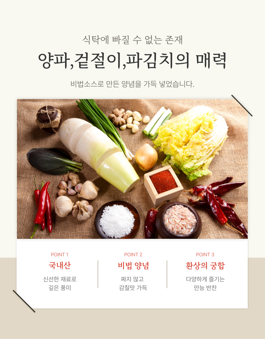 다양하게 즐기는 김치 3종 세트 (양파김치 1kg + 겉절이김치 1kg + 파김치 800g - 장날닷컴, 전라남도 로컬푸드 온라인 직매장