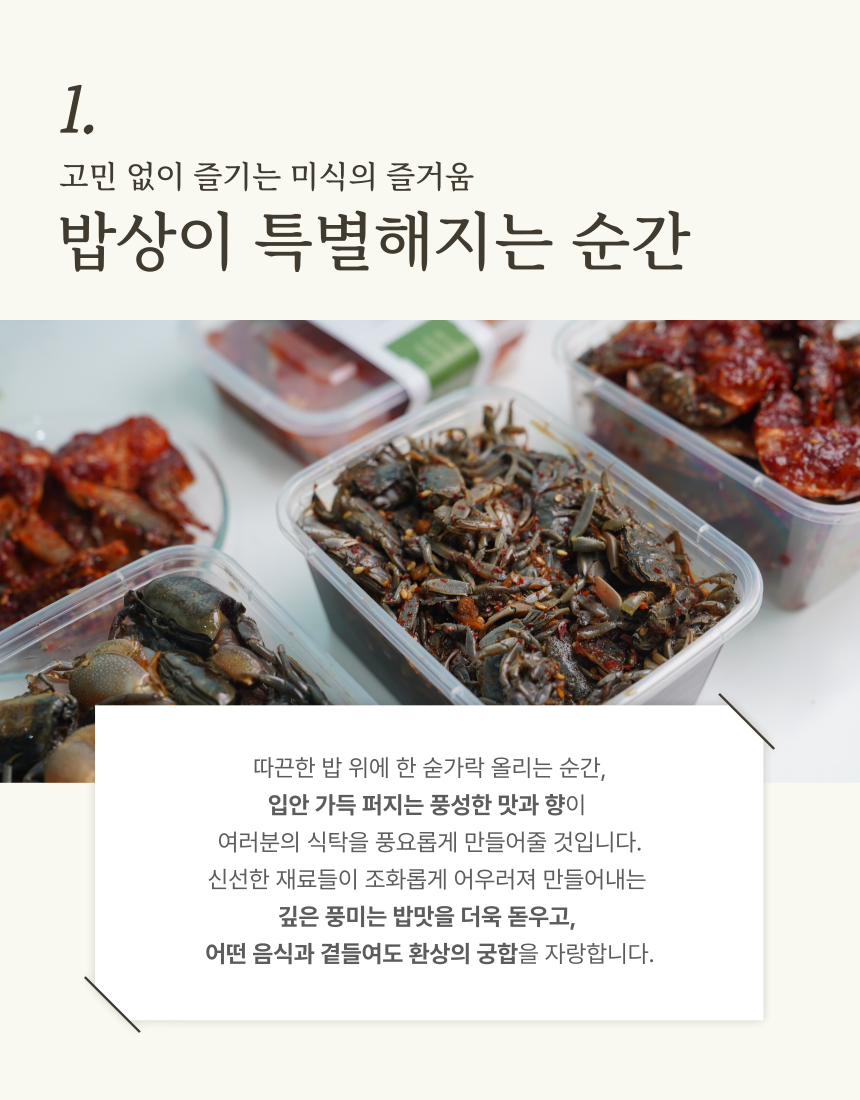 신선한 재료들이 조화롭게 어우러져 깊은 풍미는 밥맛을 더욱 돋우고, 어떤 음식과 곁들여도 환상의 궁합을 자랑하는 게장 3종세트입니다 (0)
