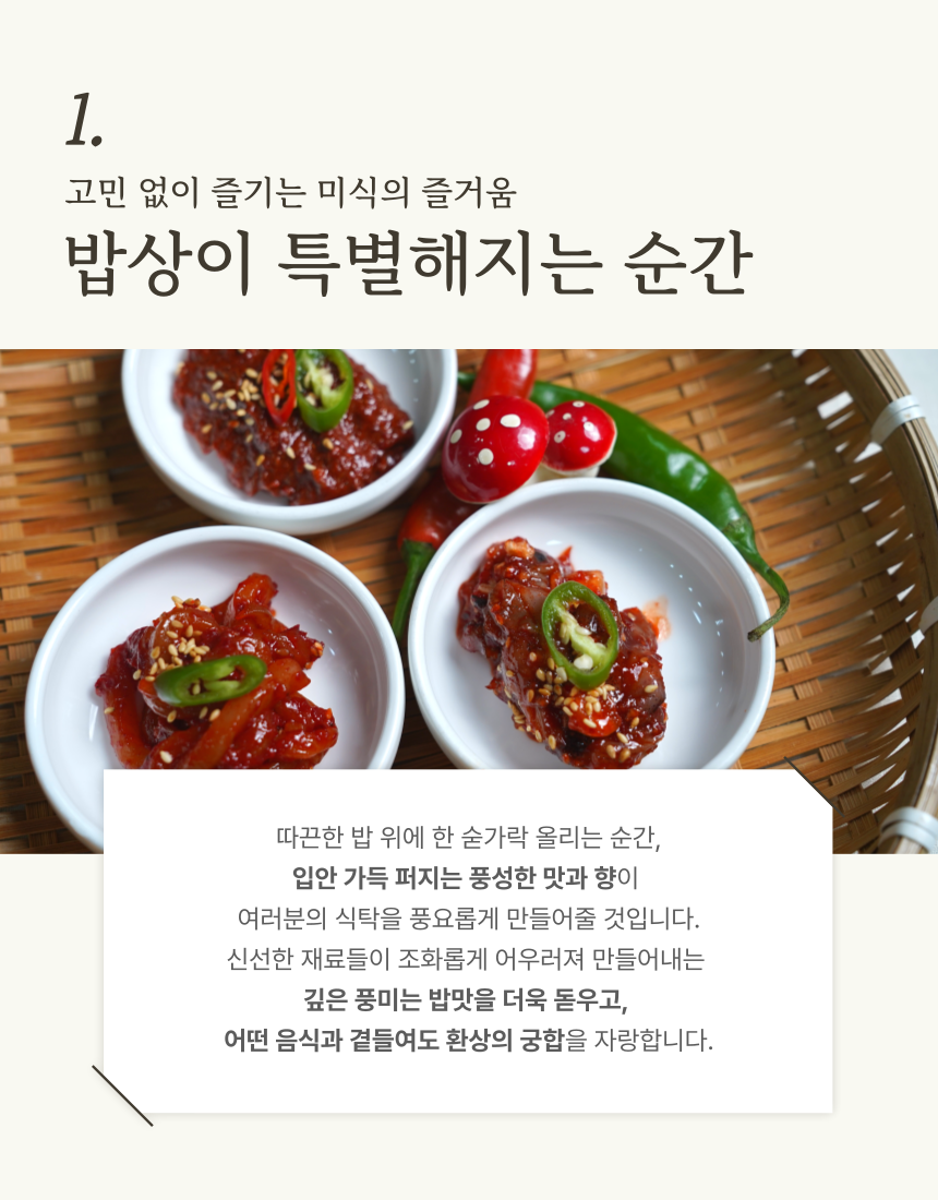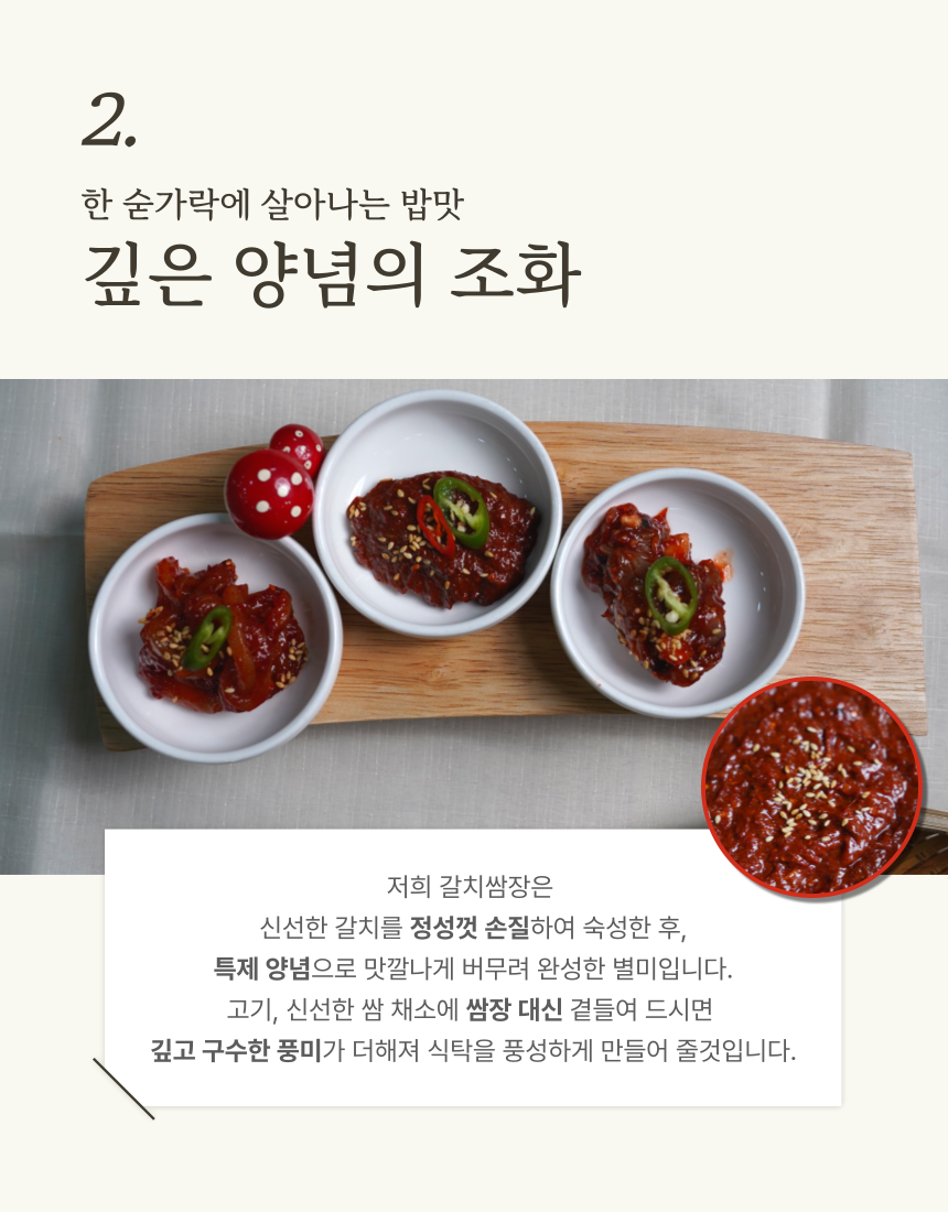 신선한 재료들이 조화롭게 어우러져 깊은 풍미는 밥맛을 더욱 돋우고, 삼겹살과 곁들여도 환상의 궁합을 자랑하는 갈치속젓입니다 (0)