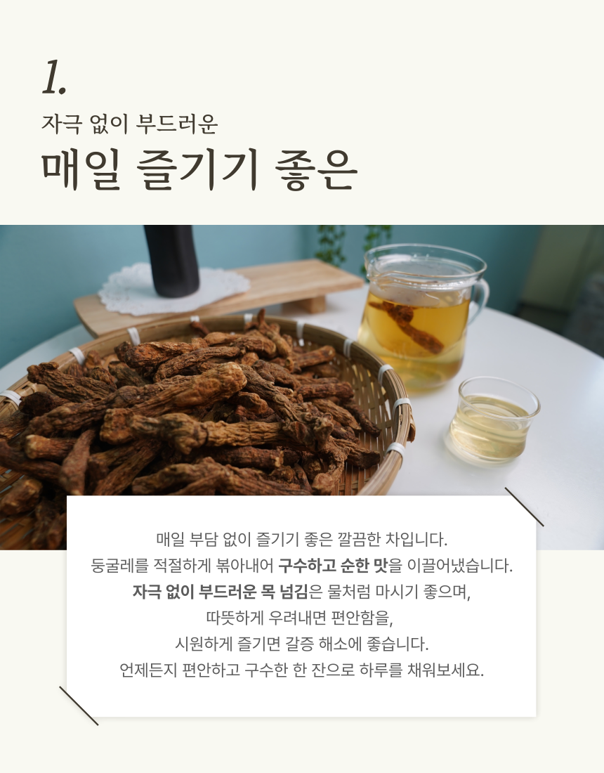 엄선된 국산 둥굴레만을 사용하여  오랜 시간 정성껏 볶아냈습니다. (0)