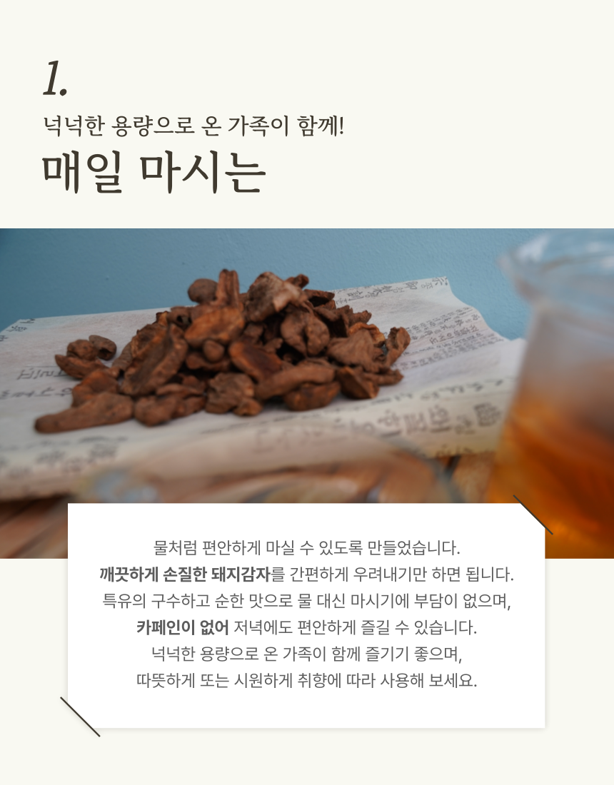 땅속 깊이 품은 자연의 에너지. 특유의 구수하고 순한 맛으로 물 대신 마시기에 부담이 없으며, 카페인이 없어 저녁에도 편안하게 즐길 수 있습니다. (1)