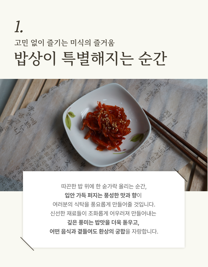 신선한 재료들이 조화롭게 어우러져 깊은 풍미는 밥맛을 더욱 돋우고, 어떤 음식과 곁들여도 환상의 궁합을 자랑하는 칠게장입니다 (0)