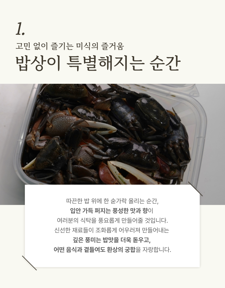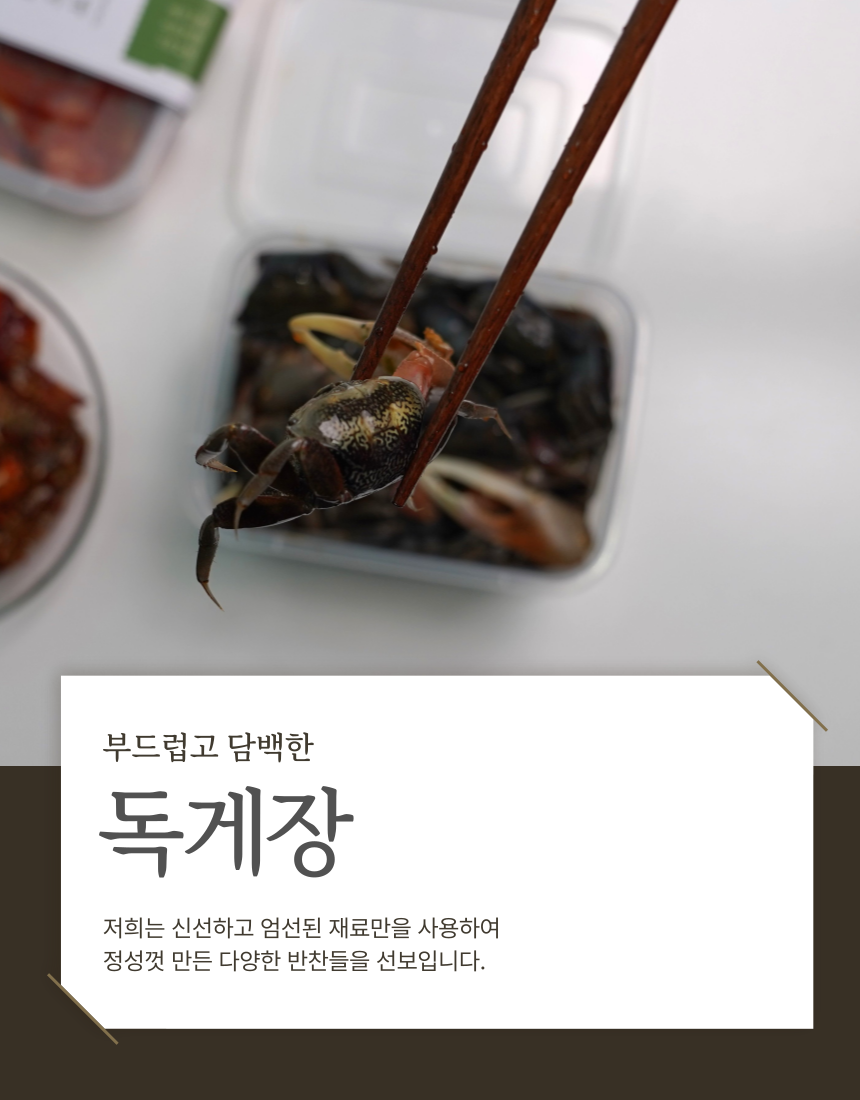 신선한 재료들이 조화롭게 어우러져 깊은 풍미는 밥맛을 더욱 돋우고, 어떤 음식과 곁들여도 환상의 궁합을 자랑하는 칠게장입니다 (0)