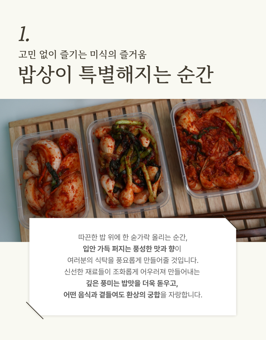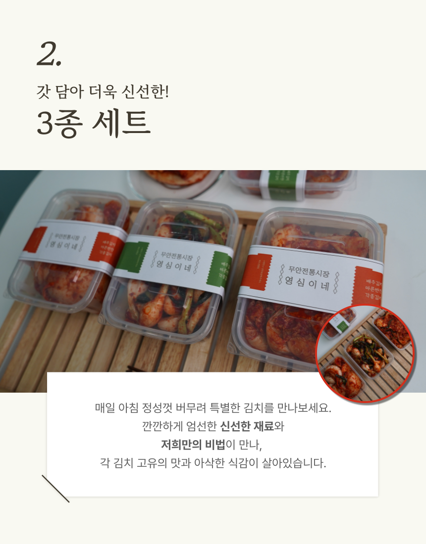 다양하게 즐기는 김치 3종 세트 (양파김치 1kg + 겉절이김치 1kg + 파김치 800g - 장날닷컴, 전라남도 로컬푸드 온라인 직매장