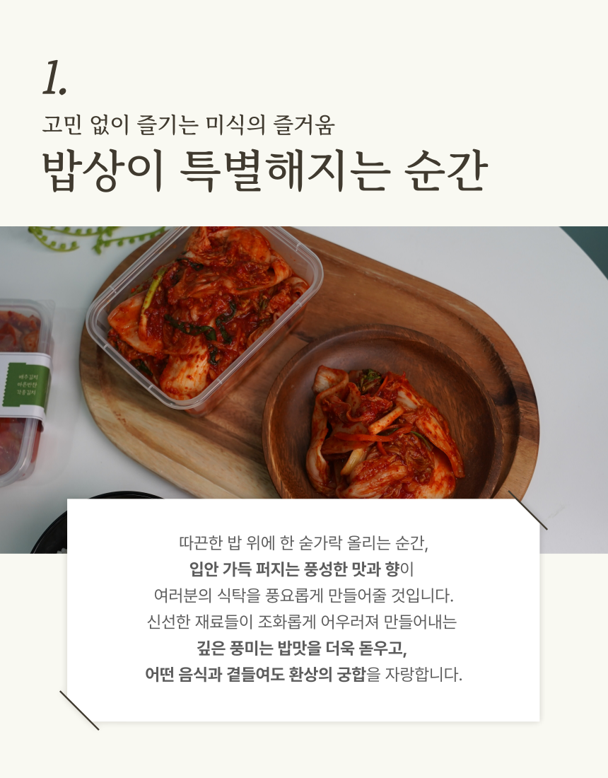 신선한 재료들이 조화롭게 어우러져 깊은 풍미는 밥맛을 더욱 돋우고, 어떤 음식과 곁들여도 환상의 궁합을 자랑하는 알배추 겉절이 입니다 (0)