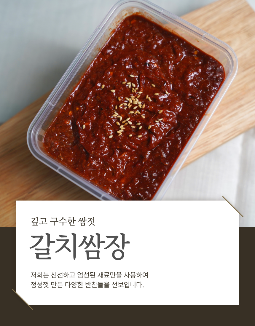 신선한 재료들이 조화롭게 어우러져 깊은 풍미는 밥맛을 더욱 돋우고, 삼겹살과 곁들여도 환상의 궁합을 자랑하는 갈치속젓입니다 (0)
